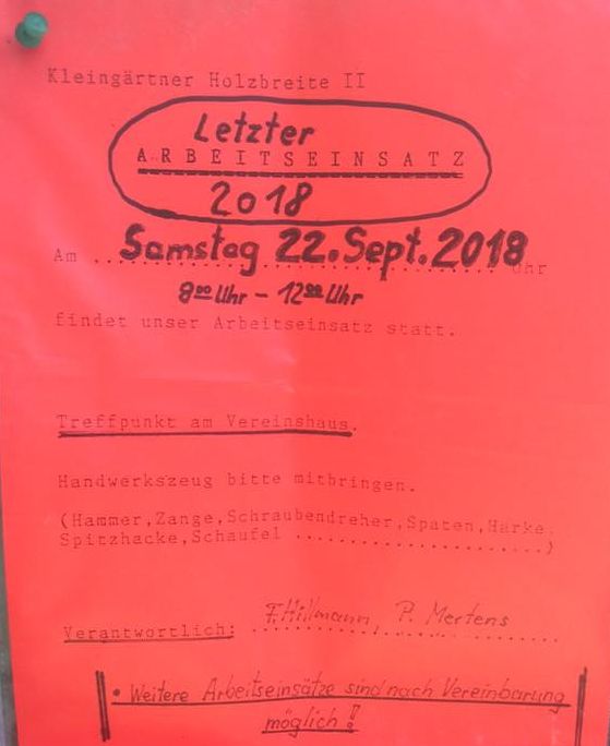 Wer noch seine Arbeitsstunden ableisten möchte und bis jetzt noch keine Gelegenheit dazu hatte, kann jederzeit noch beim Vorstand nachfragen, es gibt genügend kleinere Arbeiten zu erledigen.