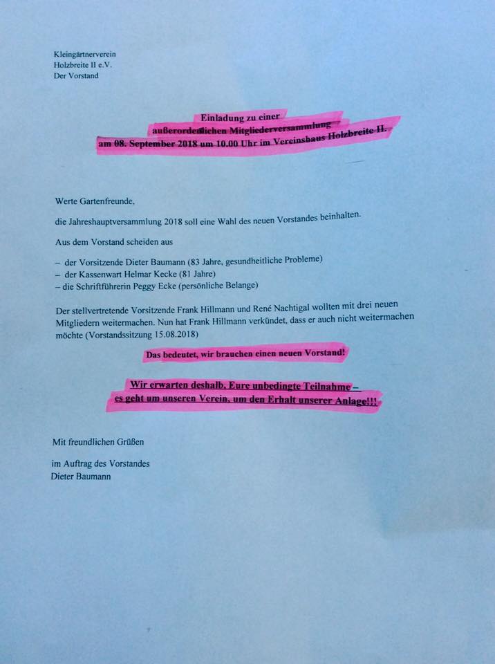 Am 8 September 2018 findet eine außerordentliche Mitgliederversammlung statt. Alle Gartenfreunde werden gebeten daran teilzunehmen. Hauptsächlich soll sich mit der Bildung eines neuen Vorstandes befasst werden.