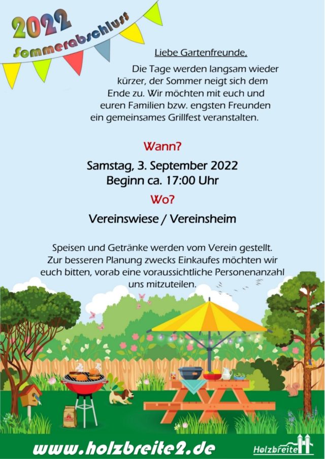 Wie in der Mitgliederversammlung vom Juni bereits angekündigt, wollen wir mit euch zusammen ein gemeinsames Grillfest durchführen und in gemütlichen Runde den Spätsommer einleiten.