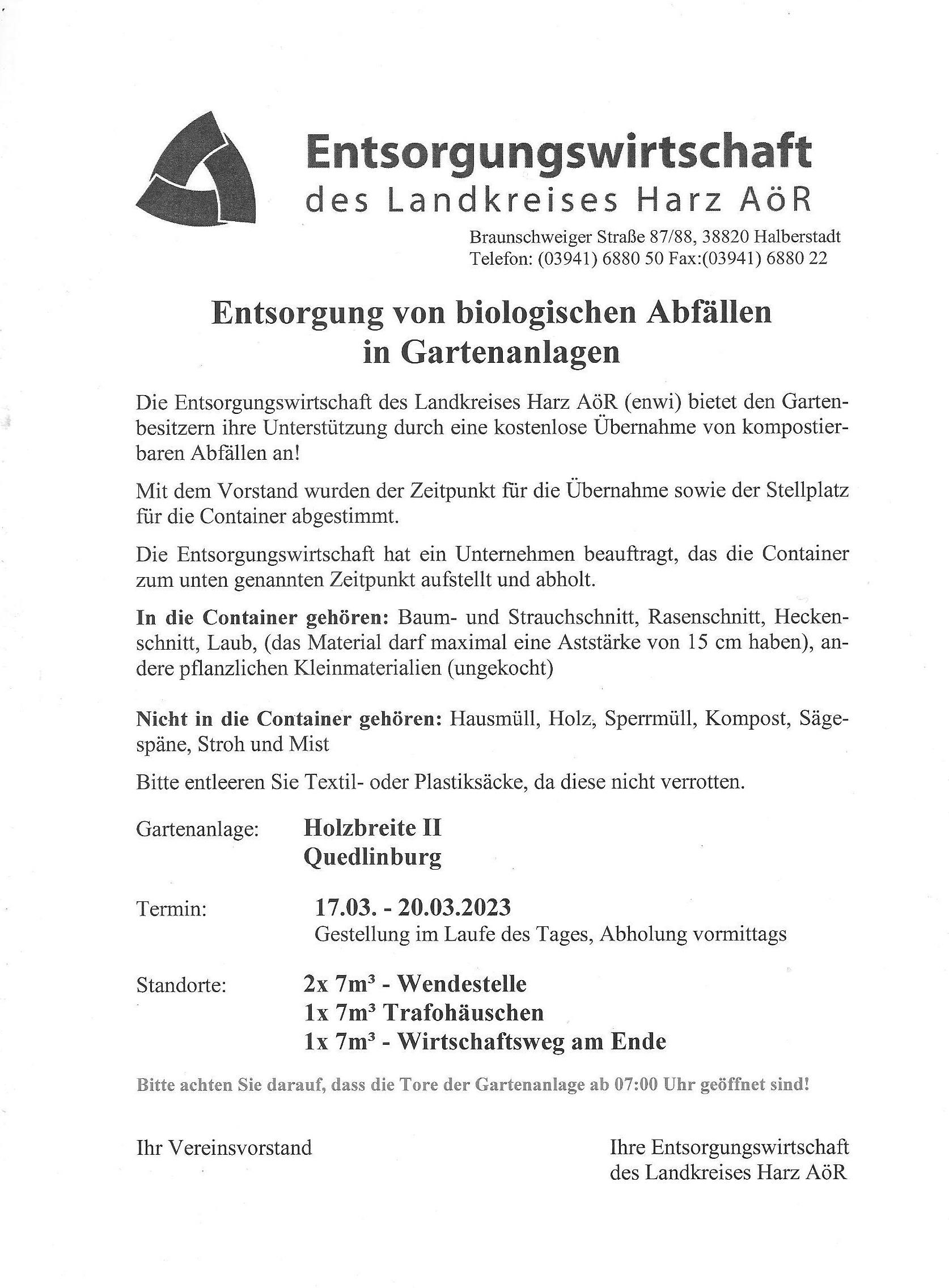 Wir bekommen auch dieses Jahr wieder von der ENWI Grünschnitt-Container gestellt. Diese werden vom 17. bis 20. März an den gewohnten Stellen zu finden sein. Bitte beachtet auch die Aushänge dazu: