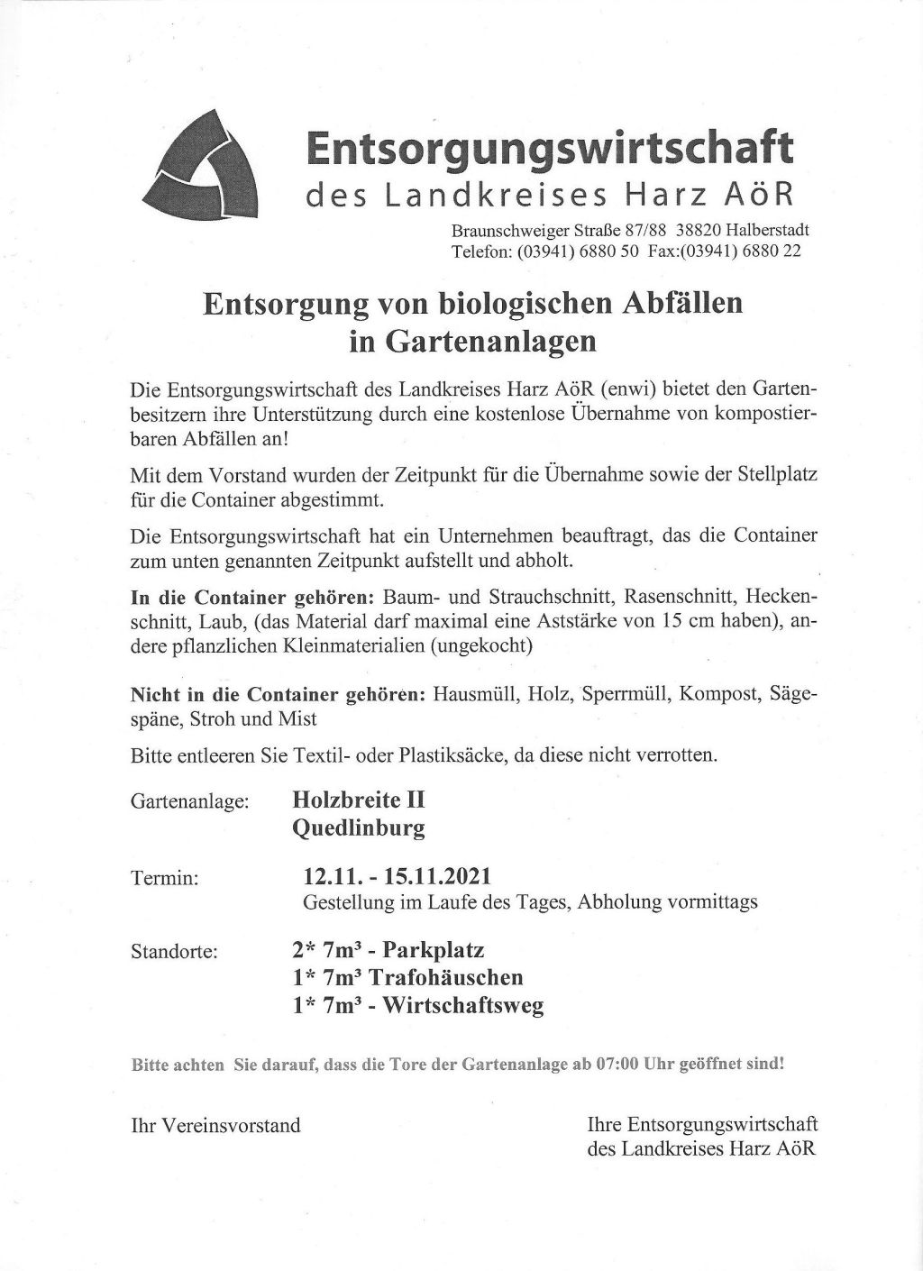 Mitte November ist es wieder soweit. Wir bekommen von der Enwi Harz wieder Grünschnitt-Container gestellt. Entsprechende Aushänge erfolgen noch.