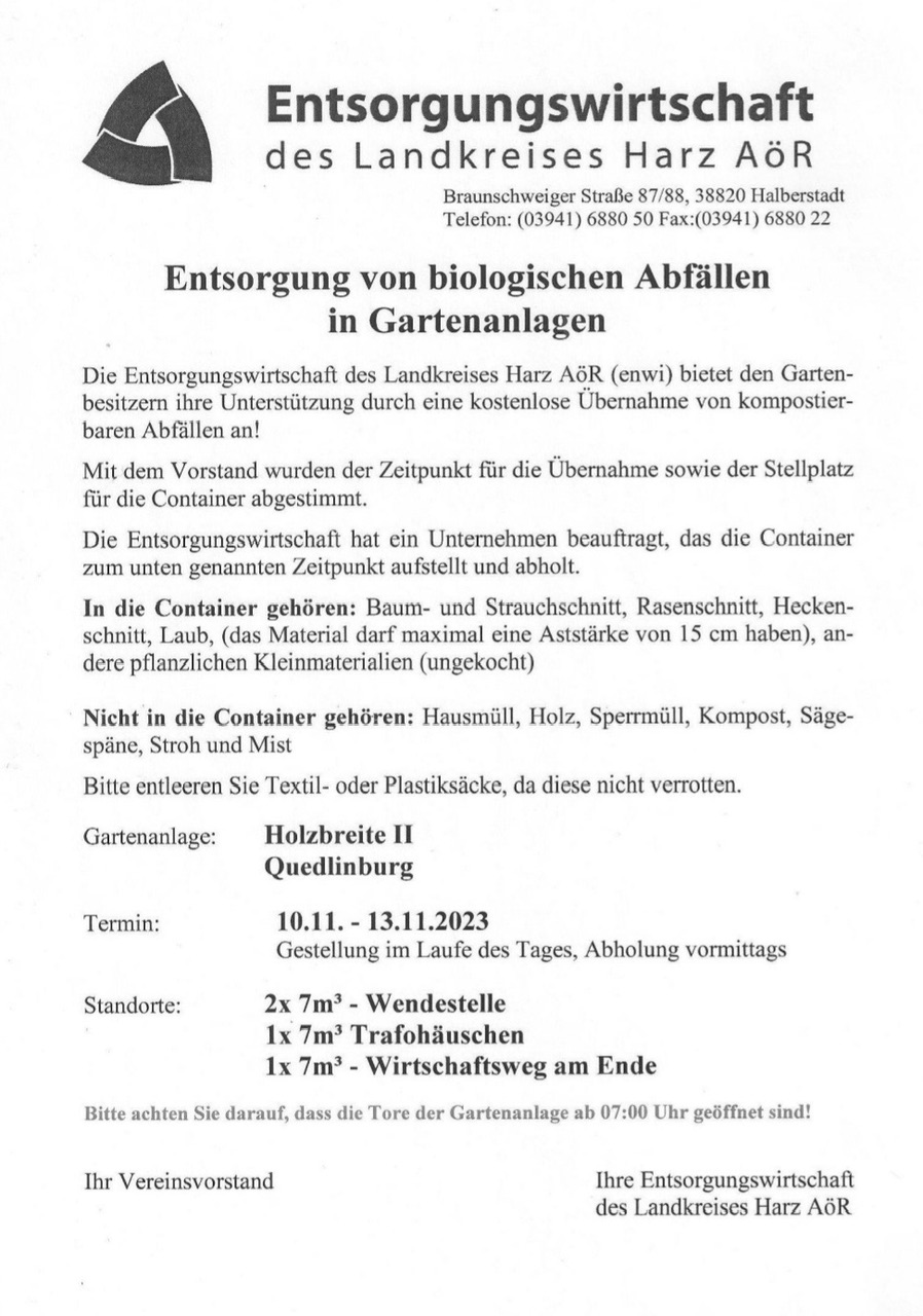 Die Container für Grünschnitt im Herbst 2023 kommen in der Zeit vom 10. bis 12. November. Bitte achtet wieder auf die Aushänge mit den Dingen, welche alle dort hinein dürfen und welche auch nicht.