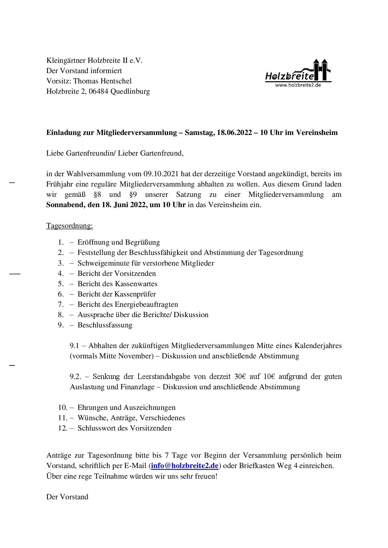 Mitglieder- versammlung 2022 18Juni2022Liebe Gartenfreunde, wie bereits letztes Jahr angekündigt, wollen wir eine Mitgliederversammlung zum Stand der Dinge im laufendem Gartenjahr durchführen. Diese Versammlung findet am Samstag, 18. Juni 2022 statt. Beginn: 10 Uhr (im Vereinsheim)